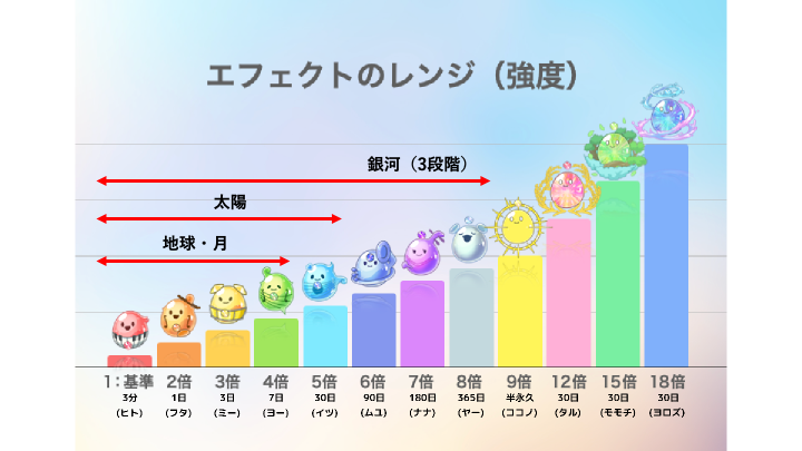 選択するキャラクターによってエフェクトのレンジの強さが変わります。